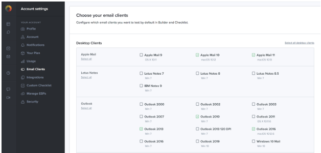 In your Litmus account, you can select exactly what email clients you want to view. You can do this by selecting Account settings, Email Clients.